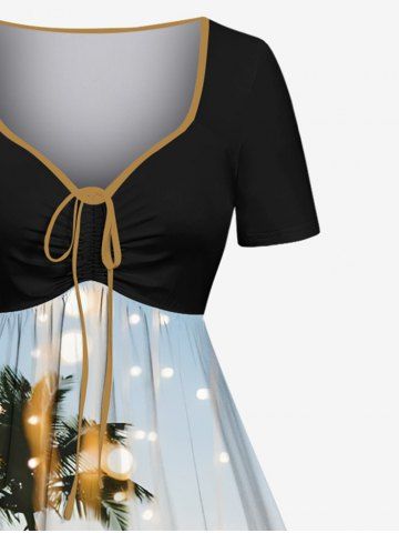 Plus Size Coconut Tree Sea Glitter Sheer Mesh Light Spot Print Hawaii Ombre Cinched A Line Dress - Black - 2x