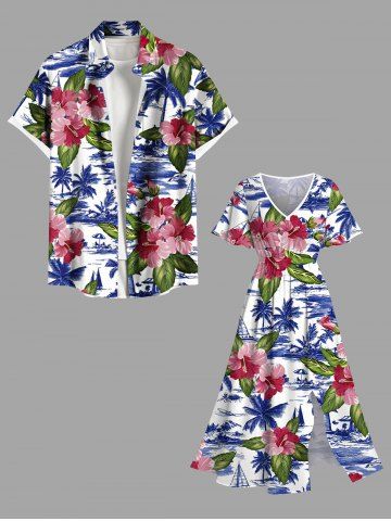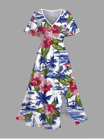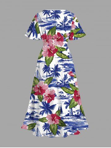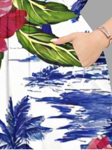 Graphic Dresses > Plus Size Coconut Tree Sea Hibiscus Flower Leaf Print Hawaii Split Pocket A Line Midi Dress