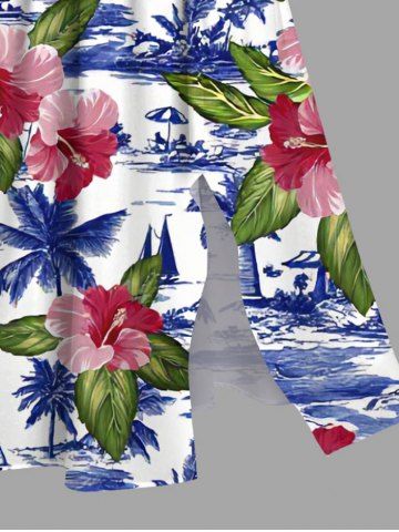 Plus Size Coconut Tree Sea Hibiscus Flower Leaf Print Hawaii Split Pocket A Line Midi Dress - Sky Blue - 1x