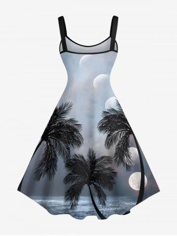 Plus Size Coconut Tree Sea Moon Ombre Galaxy Print Hawaii A Line Tank Dress - Light Gray - 5x