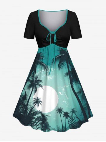 Plus Size Coconut Tree Sea Moon Print Hawaii Ombre Cinched A Line Dress - Green - L