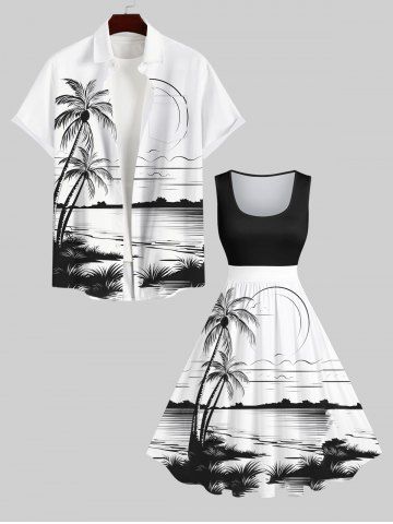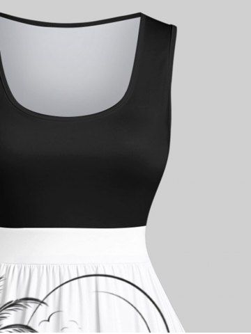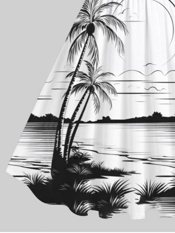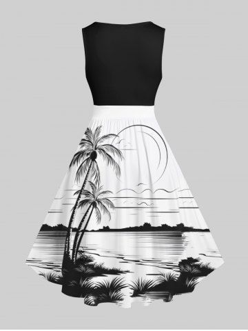 Plus Size Coconut Tree Sea Moon Print Hawaii Vintage Swing A Line Dress - Black - L