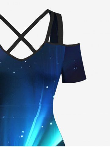 Plus Size Coconut Tree Sea Mountain Aurora Galaxy Print Cold Shoulder Crisscross Hawaii Maxi Dress - Deep Green - M