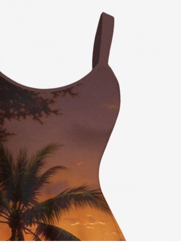 Plus Size Coconut Tree Sea Ombre Dusk Print Hawaii A Line Dress - Brown - L