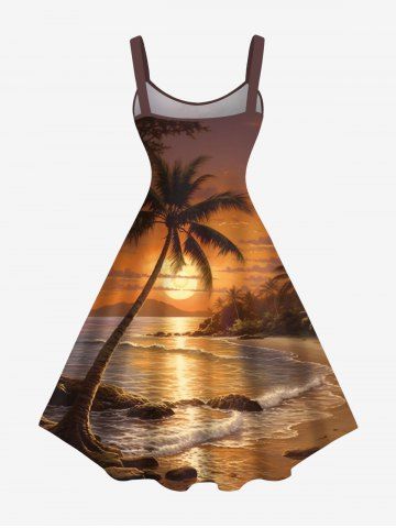 Plus Size Coconut Tree Sea Ombre Dusk Print Hawaii A Line Dress - Brown - 6x