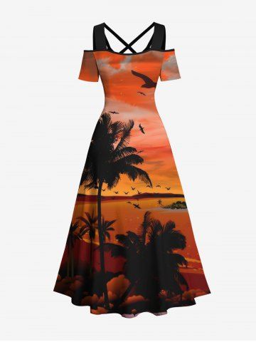 Plus Size Coconut Tree Sea Ombre Dusk Print Hawaii Cold Shoulder Crisscross A Line Maxi Dress - Orange - L