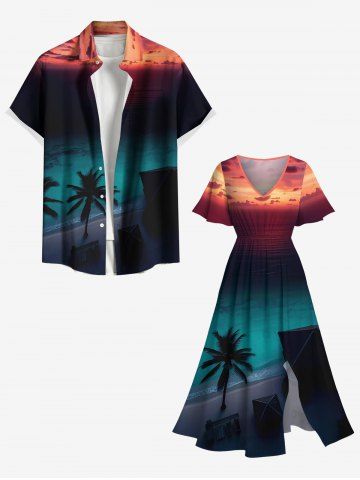 Plus Size Coconut Tree Sea Ombre Dusk Print Hawaii Split Pocket A Line Midi Dress - Multi-a - Xxs