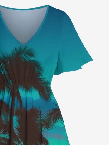 Plus Size Coconut Tree Sea Ombre Dusk Sky Print Hawaii Split Pocket A Line Midi Dress - Blue - 3x