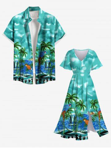 Plus Size Coconut Tree Sea Parrot Ombre Cloud Print Hawaii Split Pocket A Line Midi Dress - Green - 3x