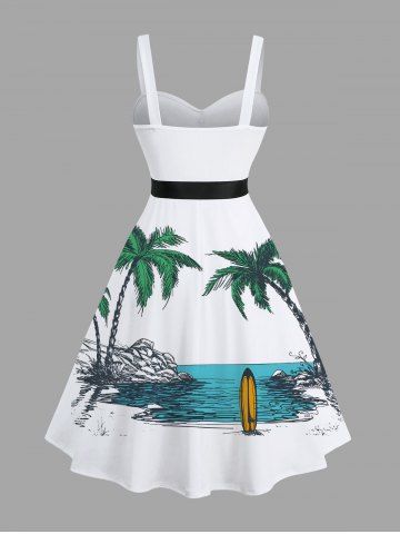 Plus Size Coconut Tree Sea Print Hawaii Button A Line Dress with Removable Belt - White - 3x