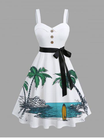 Plus Size Coconut Tree Sea Print Hawaii Button A Line Dress with Removable Belt - White - 4x