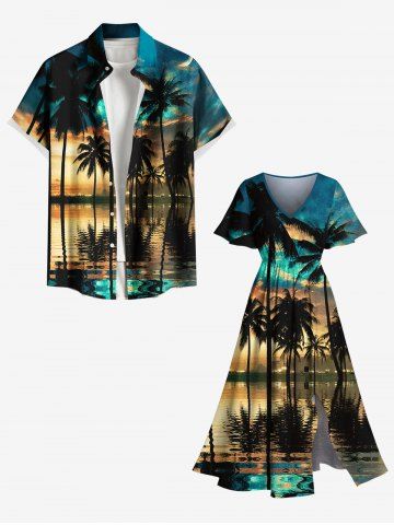 Plus Size Coconut Tree Sea Reflection Cloud Print Split Hawaii Midi Dress - Green - 6x