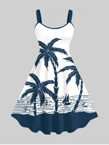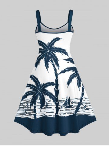 Graphic Dresses > Plus Size Coconut Tree Sea Sailboat Colorblock Print Hawaii Tank Dress