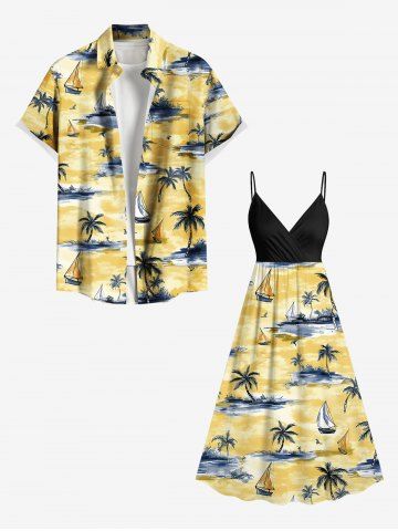 Plus Size Coconut Tree Sea Sailboat Print Hawaii Cruise Surplice A Line Cami Dress - Yellow - 3x