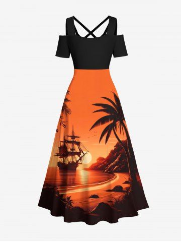 Graphic Dresses > Plus Size Coconut Tree Sea Sailboat Sunset Print Hawaii Cold Shoulder Crisscross A Line Maxi Dress