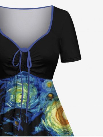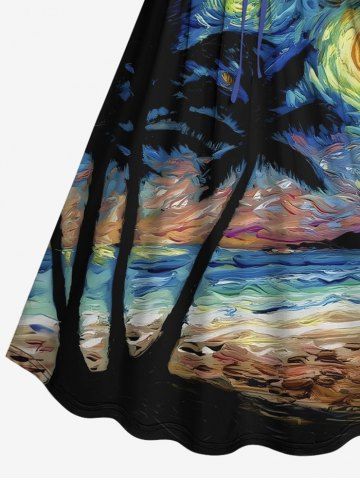 Plus Size Coconut Tree Sea Spiral Painting Print Hawaii Cinched A Line Dress - Black - L