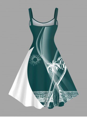 Plus Size Coconut Tree Sea Sun Curve Print Hawaii A Line Dress - Emerald - 5x