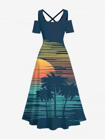 Graphic Dresses > Plus Size Coconut Tree Sea Sun Synthwave Print Cold Shoulder Crisscross Hawaii Maxi Dress