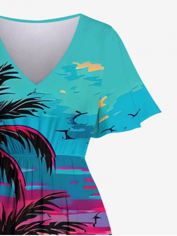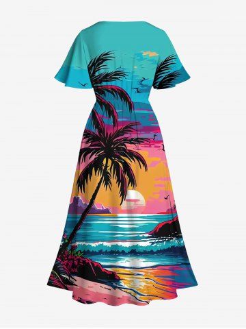 Plus Size Coconut Tree Sea Sunset Cloud Colorblock Print Split Hawaii Dress