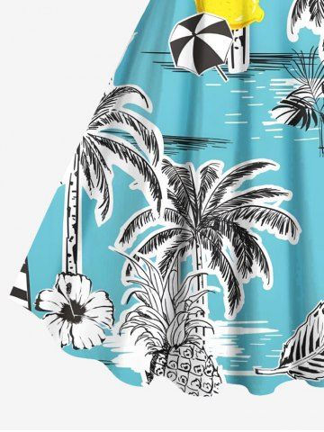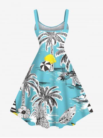 Plus Size Coconut Tree Sea Tropical Leaves Pineapple Floral Print Hawaii A Line Tank Dress - Light Blue - S