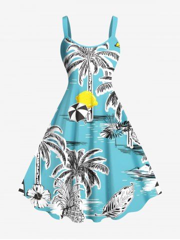 Plus Size Coconut Tree Sea Tropical Leaves Pineapple Floral Print Hawaii A Line Tank Dress - Light Blue - 4x