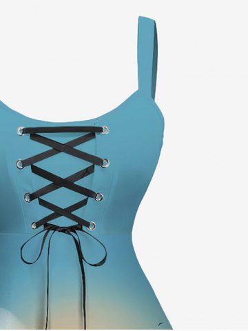 Plus Size Coconut Tree Sea Turtle Sun Cloud Ombre Sky Print Hawaii Sea Creatures Lace Up A Line Tank Dress - Green - Xxs
