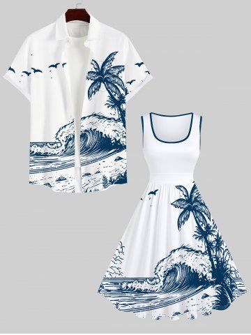 Plus Size Coconut Tree Sea Wave Beach Bird Print Hawaii Vintage Swing A Line Dress - White - L
