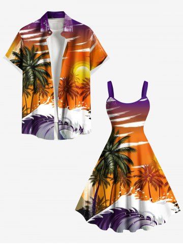 Plus Size Coconut Tree Sea Wave Sunset Ombre Sky Print Hawaii A Line Tank Dress - Orange - M
