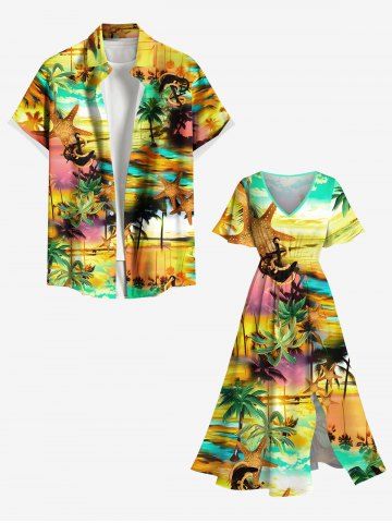 Plus Size Coconut Tree Sea Waves Beach Starfish Anchor Print Hawaii Cruise Split Pocket A Line Midi Dress - Yellow - Xs