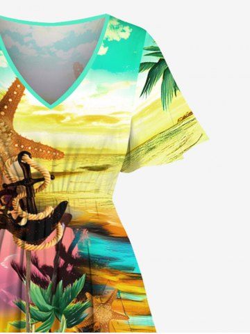 Plus Size Coconut Tree Sea Waves Beach Starfish Anchor Print Hawaii Cruise Split Pocket A Line Midi Dress - Yellow - 5x