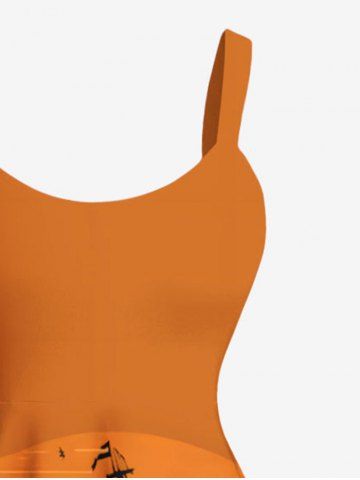 Plus Size Coconut Tree Sea Waves Boat Sun Print Hawaii Tank Dress - Orange - S