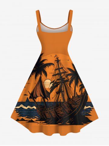 Plus Size Coconut Tree Sea Waves Boat Sun Print Hawaii Tank Dress - Orange - L