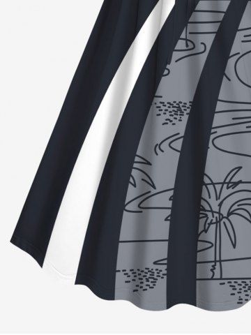 Plus Size Coconut Tree Sea Waves Colorblock Print Cinched Hawaii Dress - Black - L