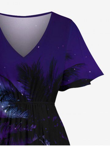 Plus Size Coconut Tree Sea Waves Galaxy Star Print Split Hawaii Midi Dress - Purple - 1x