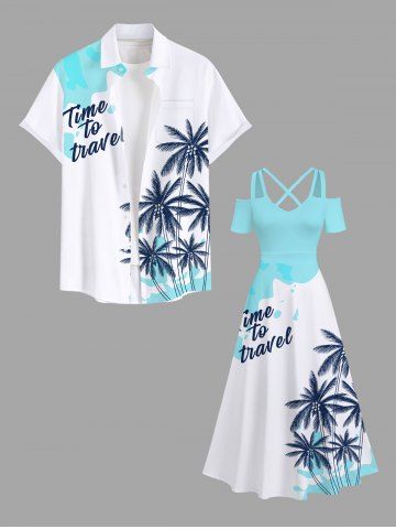 Plus Size Coconut Tree Sea Waves Letters Print Cold Shoulder Crisscross Hawaii Maxi Dress - Light Blue - Xs