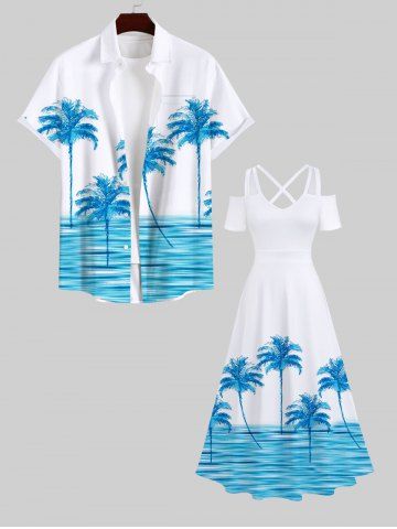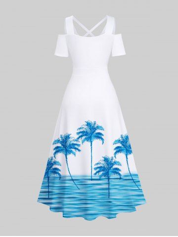 Plus Size Coconut Tree Sea Waves Print Cold Shoulder Crisscross Hawaii Maxi Dress - White - 1x