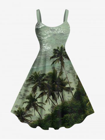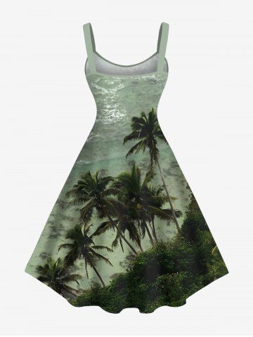 Plus Size Coconut Tree Sea Waves Print Hawaii A Line Tank Dress - Green - 1x