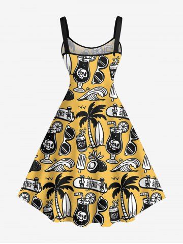 Plus Size Coconut Tree Sea Waves Skull Juice Sunglasses Ice Cream Print Hawaii A Line Tank Dress - Yellow - 6x