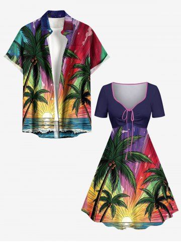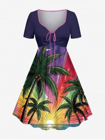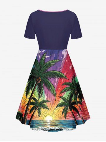 Plus Size Coconut Tree Sea Waves Sun Print Hawaii Cinched A Line Dress - Concord - Xs