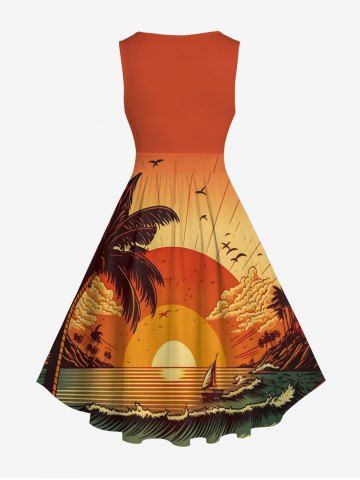 Plus Size Coconut Tree Sea Waves Sunset Print 1950s Hawaii Vintage Dress - Orange - Xxs