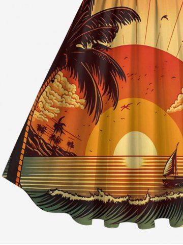 Plus Size Coconut Tree Sea Waves Sunset Print 1950s Hawaii Vintage Dress - Orange - 5x