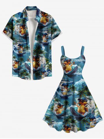 Plus Size Coconut Tree Sea Waves Surfing Ducks Ship Print Hawaii Tank Dress - Light Blue - 1x