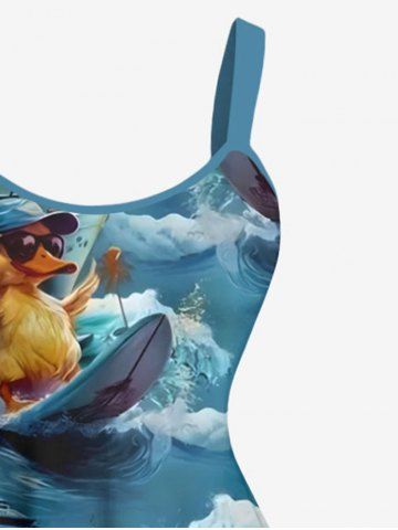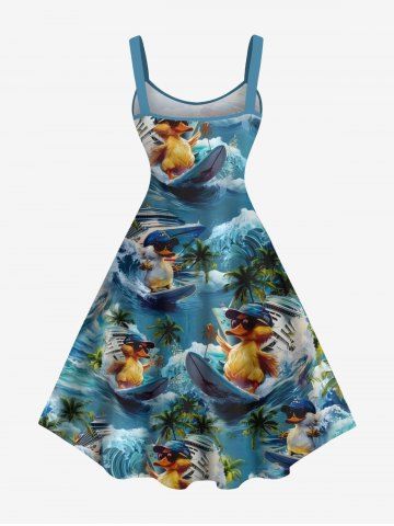 Plus Size Coconut Tree Sea Waves Surfing Ducks Ship Print Hawaii Tank Dress - Light Blue - 2x
