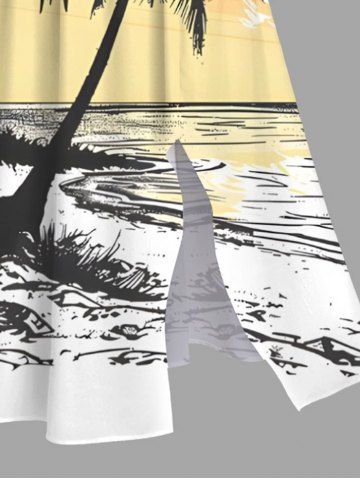 Plus Size Coconut Tree Seascape Bird Ombre Colorblock Print Split Hawaii Midi Dress - White - L