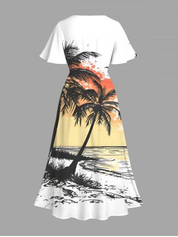 Plus Size Coconut Tree Seascape Bird Ombre Colorblock Print Split Hawaii Midi Dress - White - 3x
