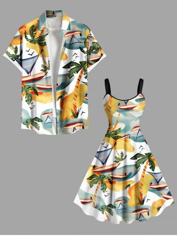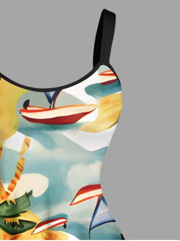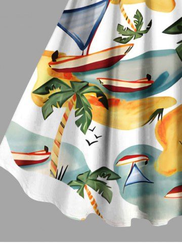 Plus Size Coconut Tree Seascape Bird Print Hawaii A Line Dress - Yellow - 1x