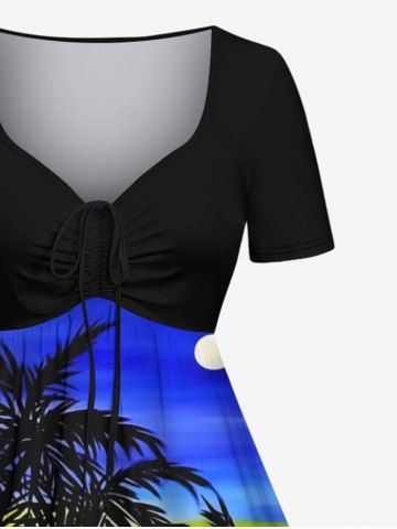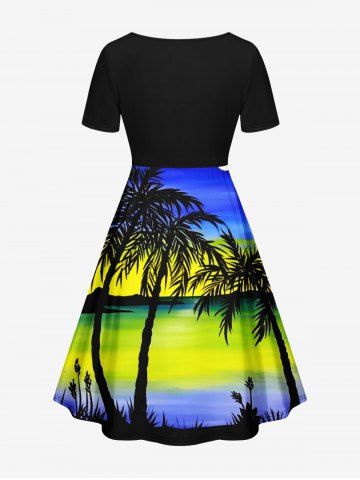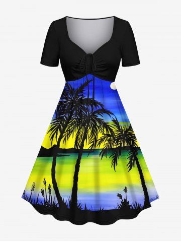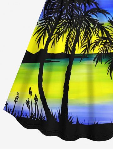 Plus Size Coconut Tree Seascape Colorblock Sky Print Cinched Hawaii Dress - Blue - L
