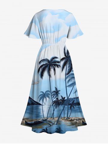 Plus Size Coconut Tree Seascape Ombre Sky Print Hawaii Split Pocket A Line Midi Dress - Blue - 4x