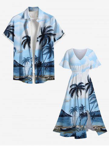 Plus Size Coconut Tree Seascape Ombre Sky Print Hawaii Split Pocket A Line Midi Dress - Blue - 6x