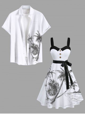 Plus Size Coconut Tree Seascape Print Buttons Turn Down Collar Hawaii Dress With Belt - White - L
